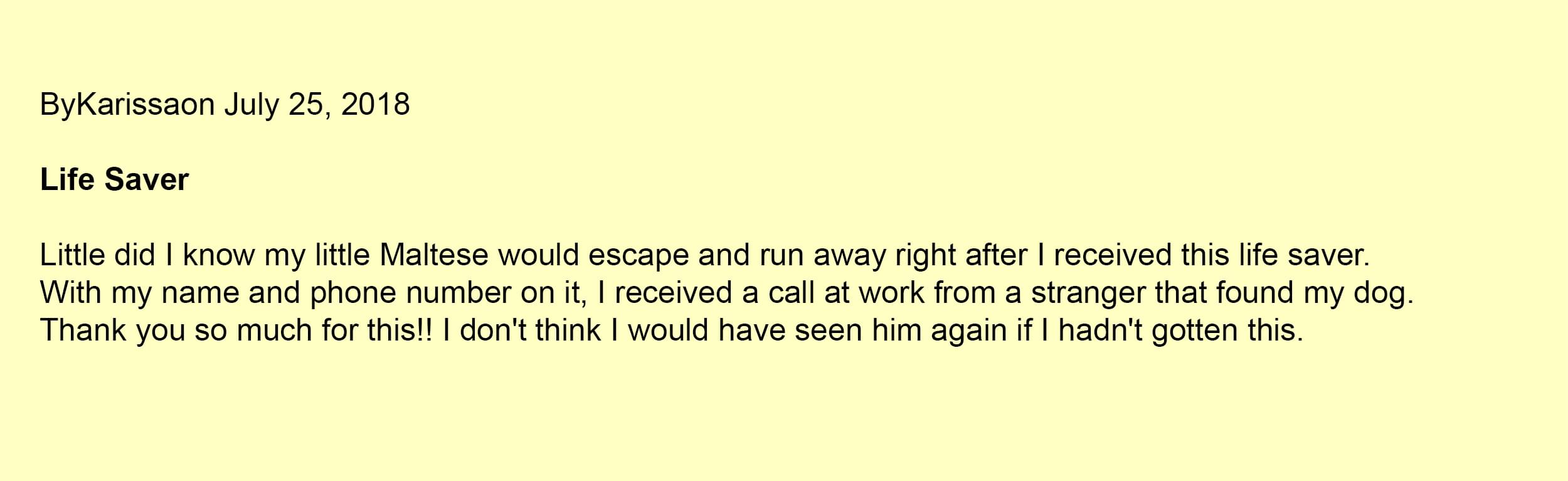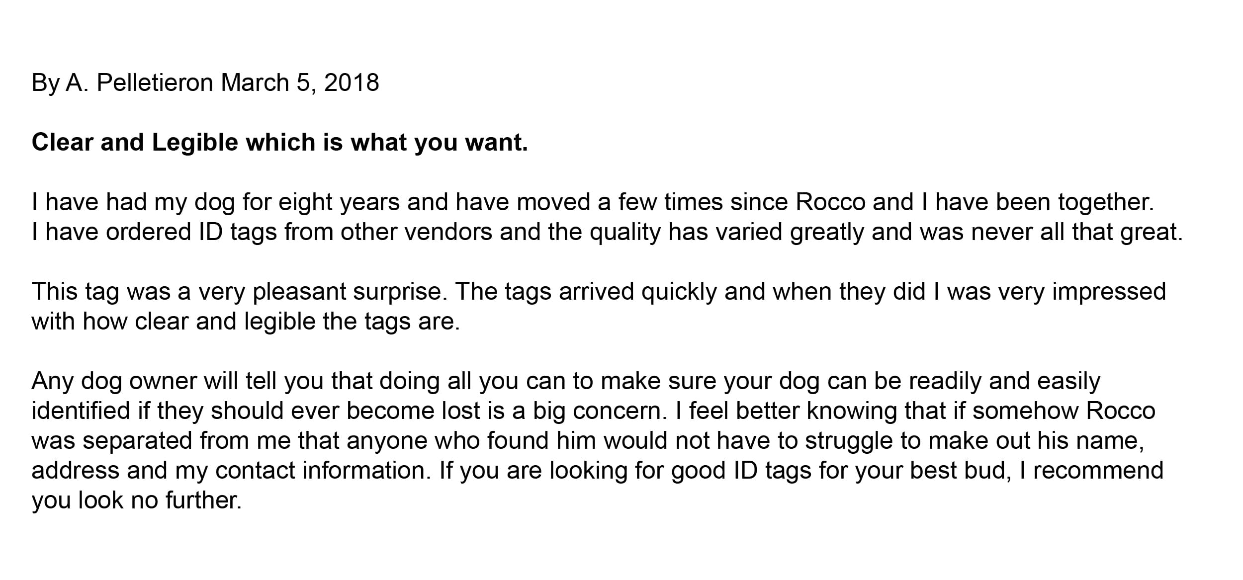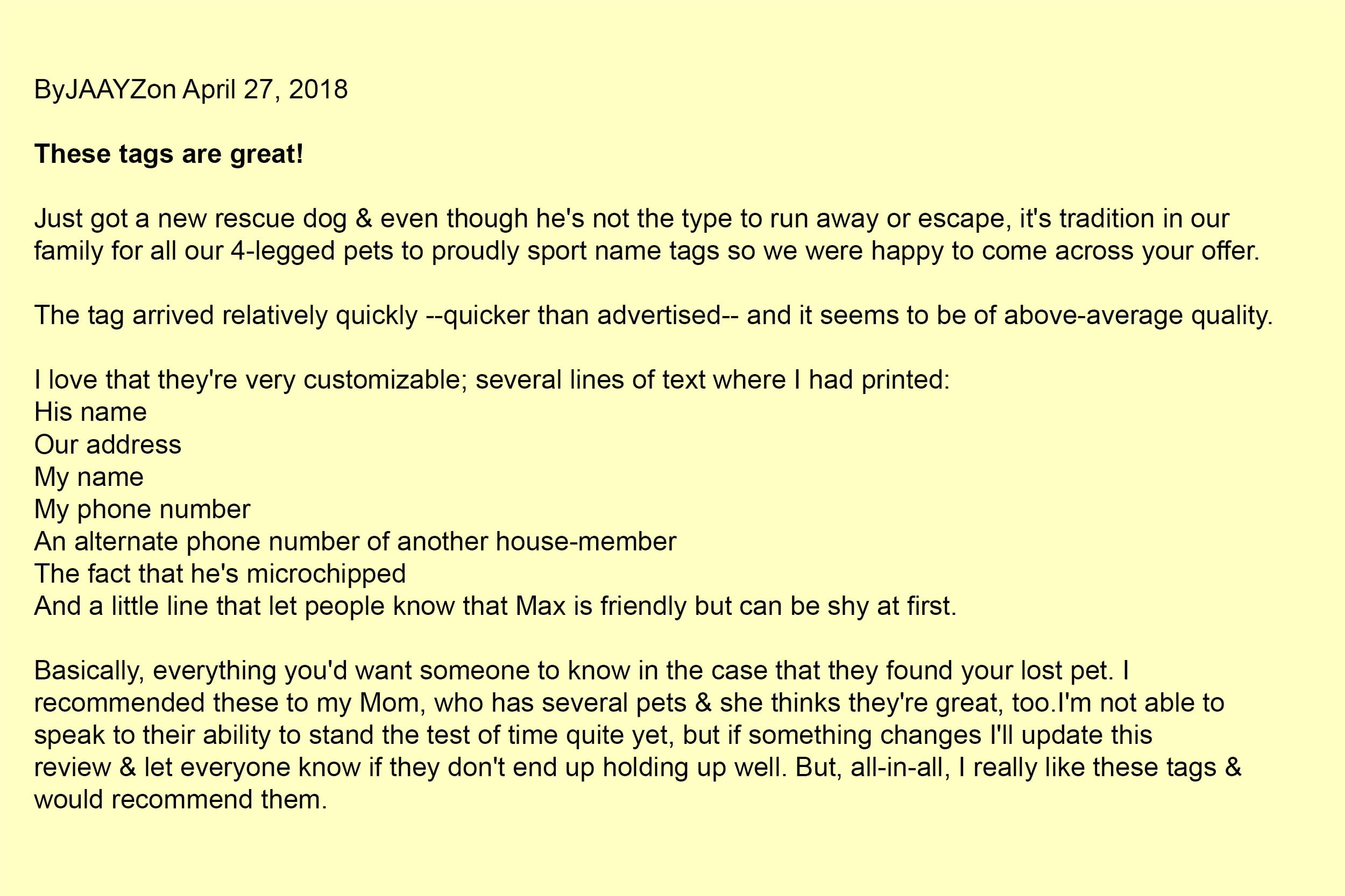Create your personalized tag with up to 4 lines of text on the front and an additional 3 lines on the back. With your dog wearing this good looking, long-lasting tag you can feel confident that they will get home safely if they ever become lost.